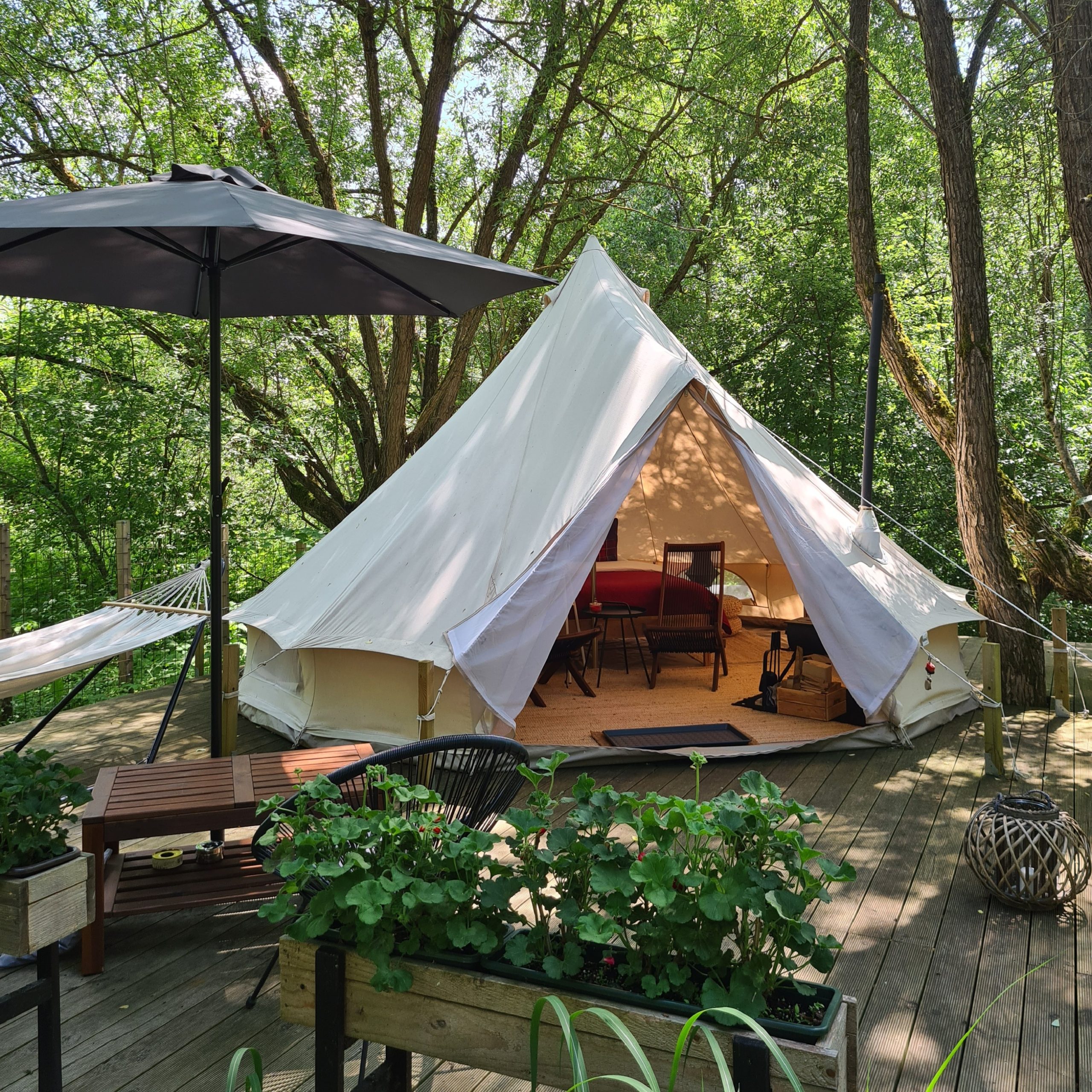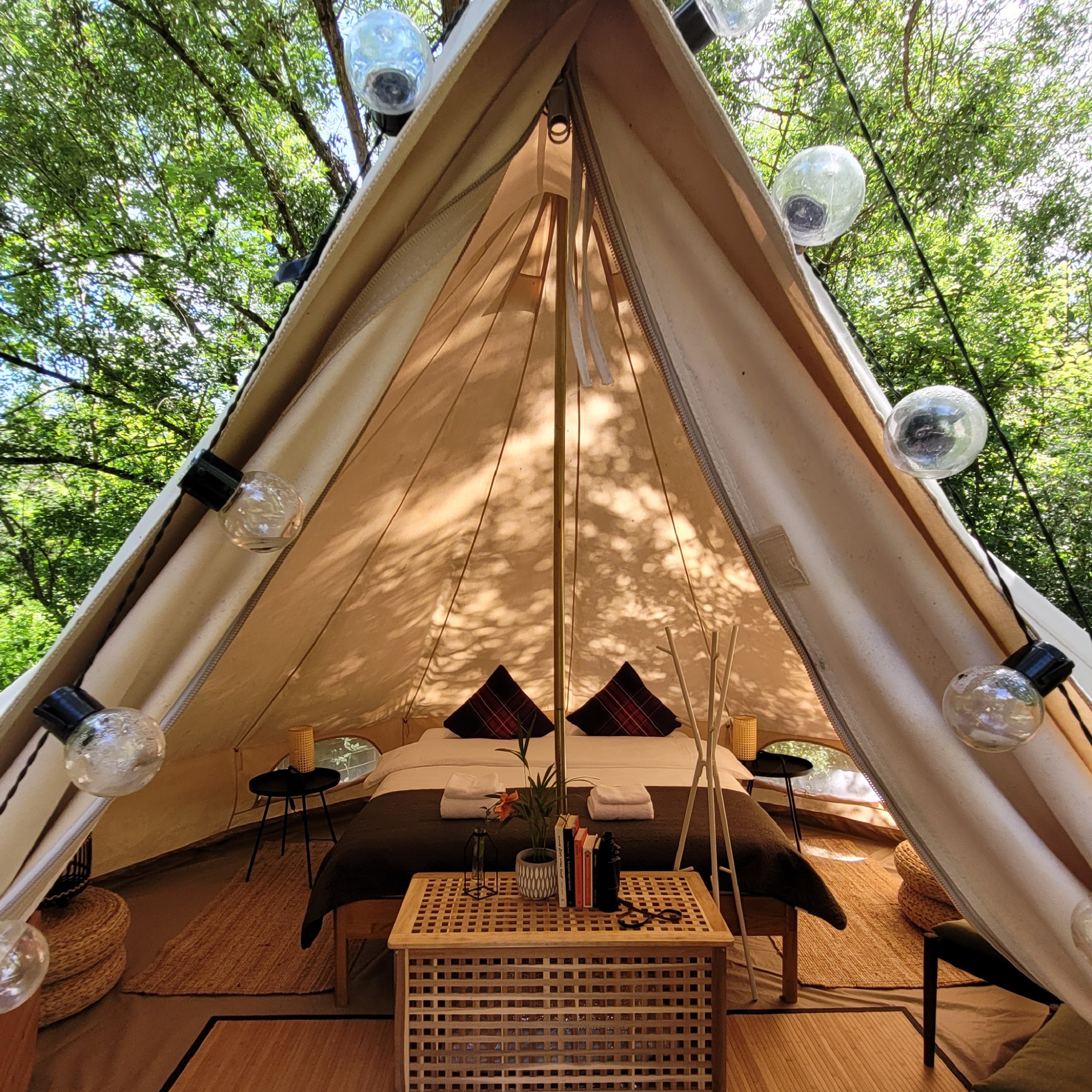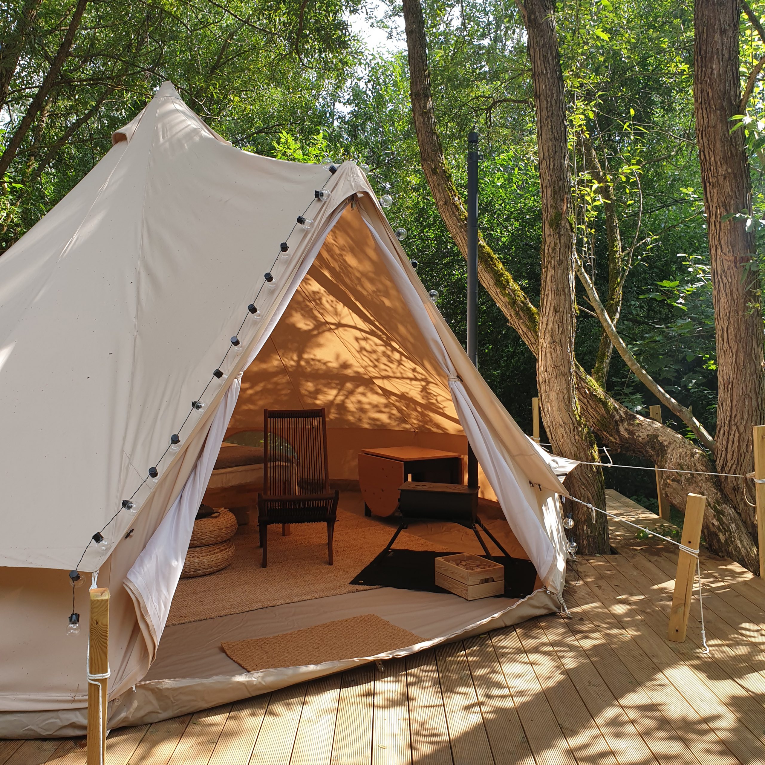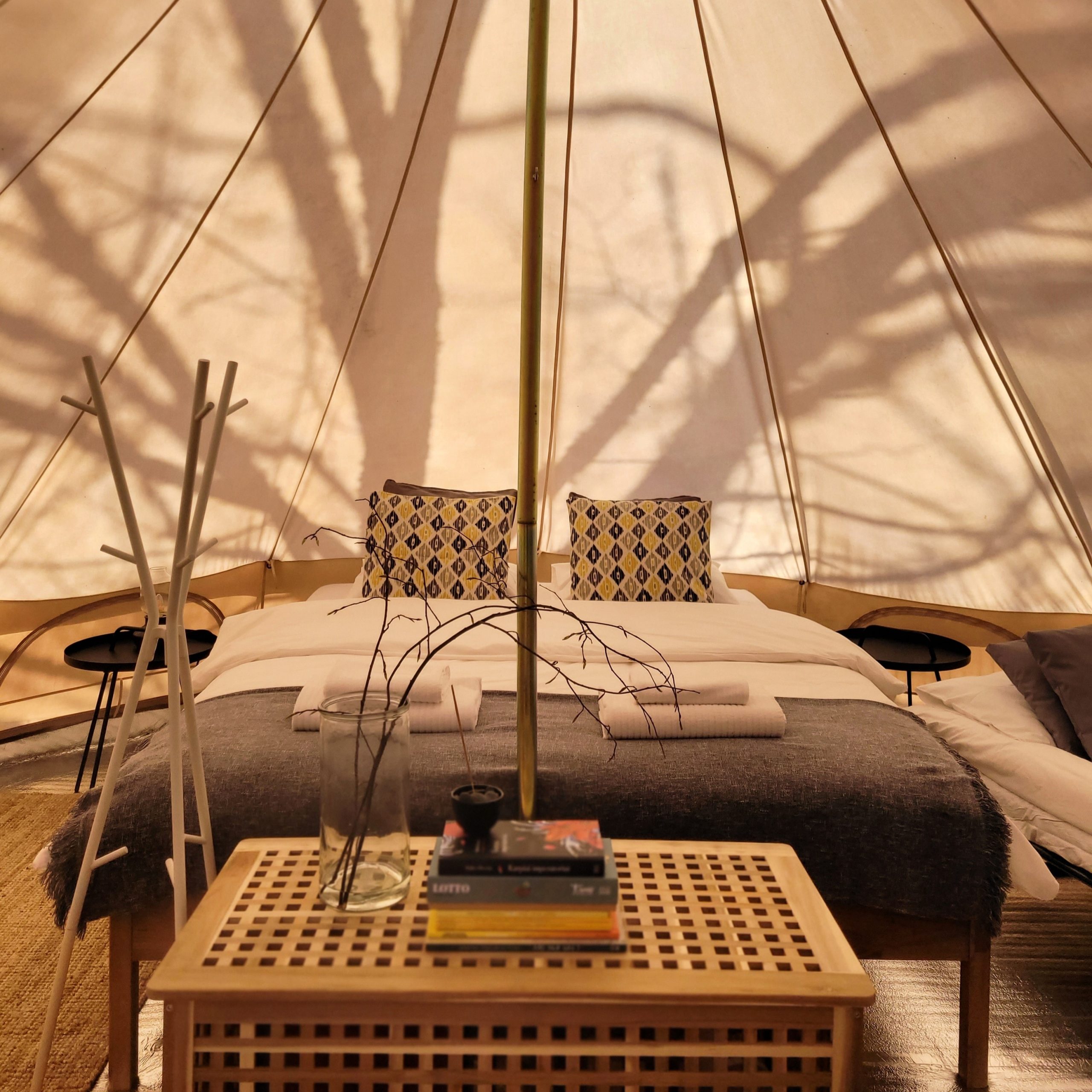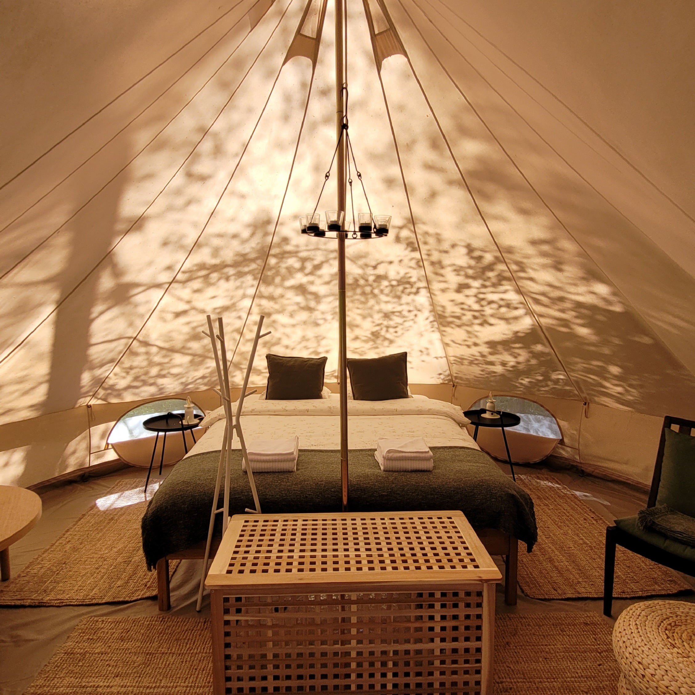 Čia rasite dvigulę lovą (160×200 cm) su minkštu čiužiniu, švarią patalynę, krėslus, stalą … Palapinės medžiaga yra pasiūta iš medvilninio drobinio audinio, todėl šaltą dieną ji išlaiko šilumą, o karštą dieną išlieka vėsi dėl savo izoliacinių, bet kvėpuojančių savybių. Taip pat joje yra įmontuoti tinkleliai nuo uodų, kurių dėka galėsite ramiai miegoti naktimis.